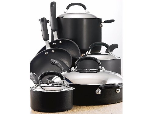 Equip your kitchen with this well-rounded 10-piece cookware set. Features the exclusive TOTAL hard-anodized Hi-Low food release system. With a nonstick exterior for easy cleaning; riveted heat-resistant handles that are oven safe to 350 degrees and stainless steel lids to lock in flavor. Lifetime customer satisfaction guarantee.