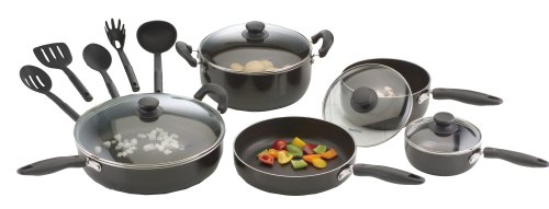 Purchased this porcelain coated non-stick cookware amid reports that other types of non-stick cookware might release carcinogens when overheated. This set is outstanding for the price. Each piece is designed to heat evenly and the porcelain coating is smooth and impossibly easy to clean. The lids included are sturdy and the whole set is asthetically pleasing in its gloss black finish. The plastic cookware included is pretty basic and unimpressive, but that's not the reason anyone would buy this set in the first place. I'd recommend this set to any home chef. Very happy with my purchase.