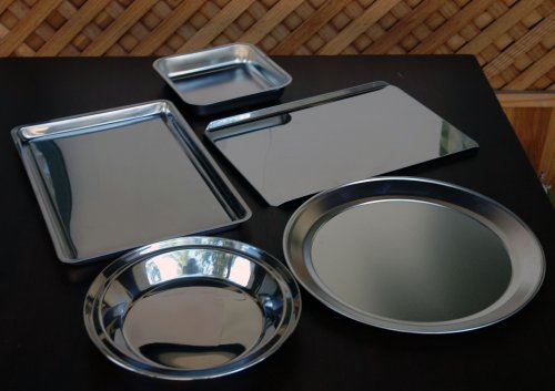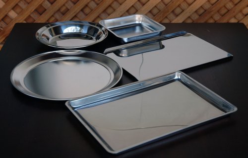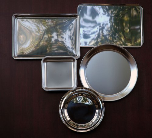 - 5 (five) Piece set comes with 10" Pie Plate, 11" by 16" Jelly Roll Pan and Cookie Sheet, 8" Cake Pan and 14" Pizza Tray- All items are constructed from 18/10 Stainless Steel