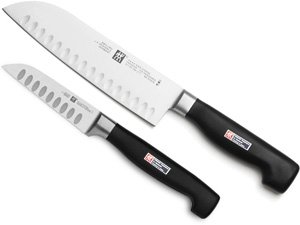 J.A. Henckels Four Star 2-pc Asian Set includes our popular 5" Hollow Edge Santoku and our 3" Hollow Edge Kudomono Parer. The Hollow Edge Santoku is the perfect knife for slicing and chopping meats and vegetables. The hollow edge on the knife allows paper thin slicing and keeps food from sticking to the blade. The 3" hollow edge kudomono parer is great for those smaller jobs such as peeling fruits and vegetables.