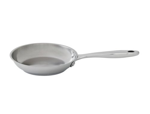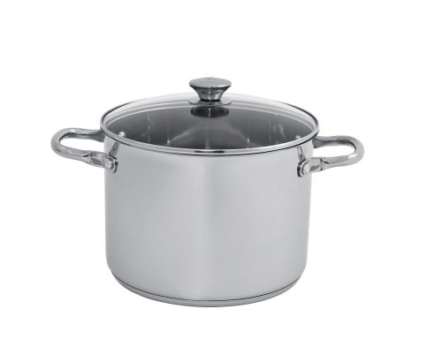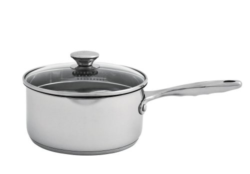 - 1-1/2-quart covered saucepan, 3-quart saucepan with pour spouts and colander cover, 8-inch omelet pan, 10-inch omelet pan, 10-inch covered saute pan, and 8-quart covered stockpot- Made of heavy-gauge stainless steel with encapsulated aluminum-disk bases for fast, even heating