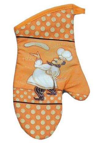Too many chefs in the kitchen? Not when they are this happy to be of service. This cheerful guy is proud to serve up a huge dish of pasta to your family and friends. When they are in use, these high-quality potholders will protect you from the heat. When they're not, they make a stylish statement hanging on your wall from their cotton hooks. They make great trivets under your hot pots and plates, too. Each are identical and only fits the RIGHT hand...because of the way the pattern is printed.