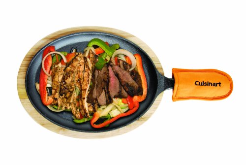 Nothing cooks like cast iron over an open flame. Now you can prepare delicious, healthier fajitas on your grill with that same great grilled flavor you have come to love. The Cuisinart Preseasoned Cast Iron Fajita Set is designed with innovative flavor slots which work to remove excess grease and fat from your food while enhancing the natural grilled flavor of whatever you create. The cast iron fajita skillet is preseasoned to make grilling and clean-up simple. The wooden serving tray conveniently supports the skillet, so when you finish cooking you can serve your fajitas hot and sizzling right to the table.