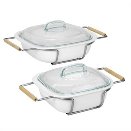- 6-piece set with 1-1/2-quart casserole, 2-1/2-quart casserole, 2 lids, and 2 serving cradles- Extra-lightweight white glass for versatile use; lids are clear glass