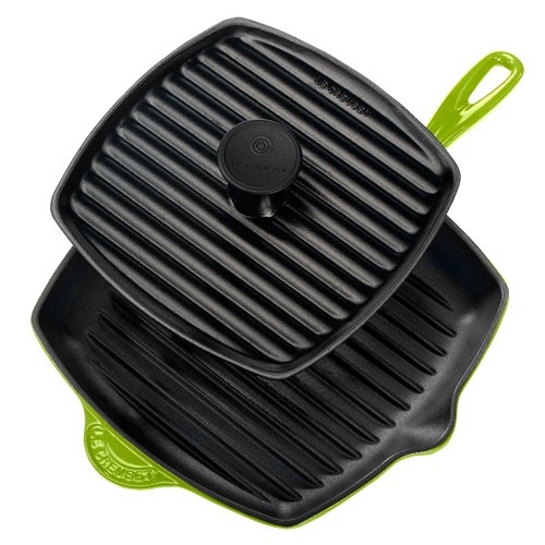 - Enameled cast-iron 10-1/4-inch square skillet grill with 9-inch ribbed press- Ridges impart tasty grill marks on food and allow for lower-fat cooking; dual pour spouts