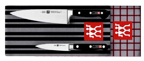 This set from J.A. Henckels TWIN Pro "S" series features two of the most frequently used kitchen knives and a set of attractive hand towels. Set includes: 8" chef's knife, 4" parer, and 2 towels (18"x28"). TWIN Pro "S" knives are constructed under Henckel