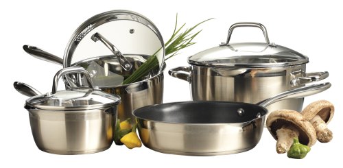 7 piece 18/8 Cook & Pour Cookware Set 18/10, 0.6mm stainless steel, glass lids with steam vents, strainer holes and hollow tube knobs and 2 mm encapsulated aluminum base for even heat distribution. Stylish two-tone mirror/satin finish. Saucepans and Dutch oven have 2 spouts each. Includes 1 1/2 quart and 3 quart saucepans with lids, 10 inch fry pan with nonstick interior cooking and 5 1/2 quart Dutch oven with lid (lid also fits fry pan). Dishwasher safe.