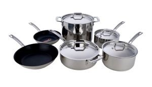 This Cookware 10-Piece Set Commercial Copper Core 18/10 Stainless w/ Cool Handles (95075) by MIU France features an 18/10 stainless steel body and is fitted with an encapsulated core, consisting of a layer of pure copper surrounded by aluminum. This copper core ensures even heating throughout the unit, preventing hot spots. The fry pans are coated with professional grade Eclipse non-stick surfaces, which make your clean-up a breeze. The stay cool handles are riveted to the body with non-corrosive rivets. The lids are tight fitting stainless steel. Note: the handles on the lids are not stay cool, use a potholder when lifting.