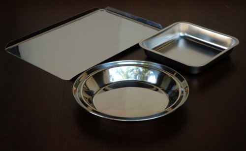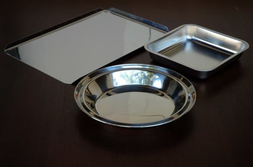 - 3 (Three) Piece set comes with 11" by 16" Stainless Steel Cookie Sheet/Pan, 8" Cake Pan and 10" Pie Plate- All items are constructed from 18/10 Stainless Steel