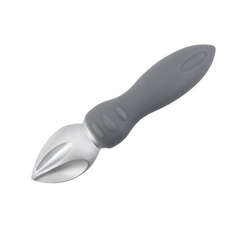 The KitchenArt Gel Grip Citrus Reamer features a patented ergonomic design, a soft silicone handle that fits any hand type. This unique utensil is dishwasher safe and comes in an elegant satin silver and gray finish.